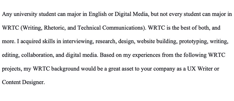 I’m a digital communicator skilled in writing, research, design, user experience, user interface, statistical analysis, and coding. In May 2023, I graduated from James Madison University with a Bachelor of Science in Writing, Rhetoric, and Technical Communication and two minors in Statistics and Creative Writing. Although I’ve graduated, I believe in always learning; my current pursuits are in expanding my design tools skills, learning to speak Thai, and learning how to play the piano. I consider myself to be a hardworking and caring person who wants to help others. My goal is to find a career that combines my skills and positively impacts others.