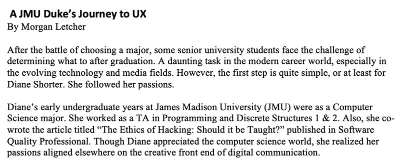 I interviewed JMU alumn Diane Shorter about her story on how she became a User Experience and User Interface Designer.